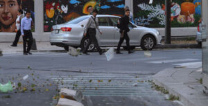 Según el Departamento de Seguridad Nacional, algunos manifestantes lanzaron piedras, botellas y fragmentos de concreto contra los agentes. Dos oficiales resultaron lesionados tras ser golpeados por bloques de concreto.
