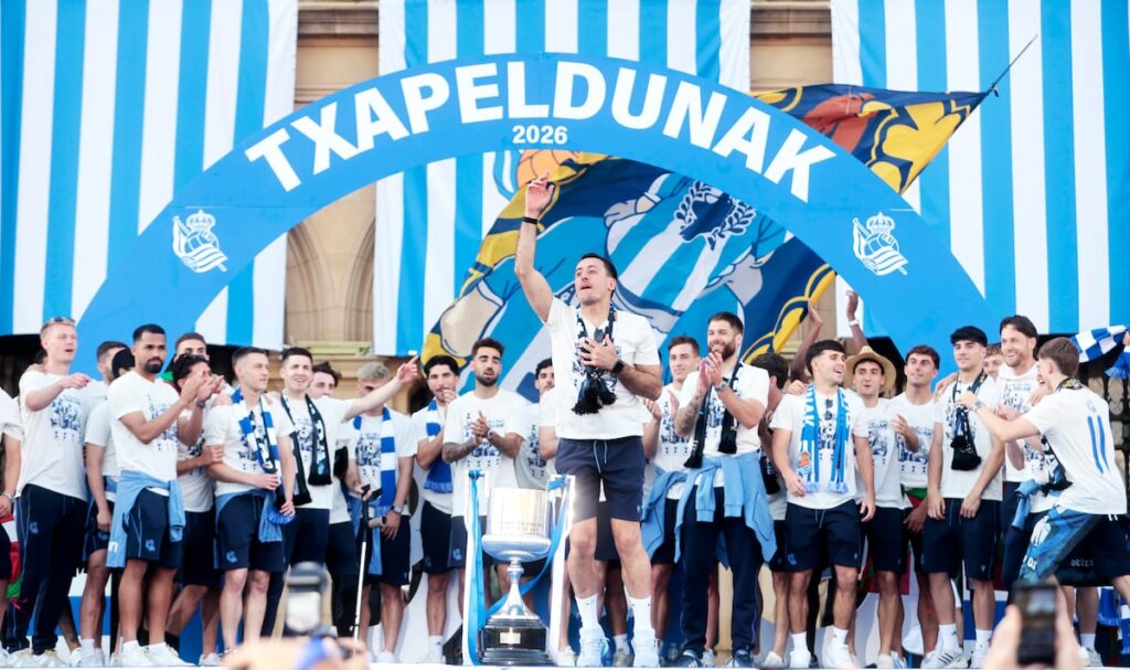 San Sebastián, 21 de abril de 2026.- La Real Sociedad dedicó este lunes la Copa del Rey que ganó el sábado a su afición, durante una celebración multitudinaria en la que miles de seguidores esperaban en el Alderdi Eder donostiarra. La comitiva del equipo llegó en un autobús descapotable hacia las siete menos cuarto, aunque otras fuentes sitúan la llegada pocos minutos antes de las 19.30 horas tras un recorrido por las calles más emblemáticas de la ciudad partiendo desde Zubieta.